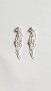 The perfect fusion of tonal bridal elegance and edgy style. Featuring cascading Swarovski pearls and a romantic tassel design, this drop earring offers bold movement and a modern regal aesthetic. Make a statement that's effortlessly unique.