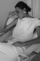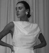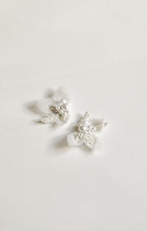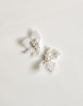 Organza petals, matte beading + pearl accents— bursts of modern + romantic accents. A mix of structured pearls balances the softness of the delicate petals for a cohesive overall style.