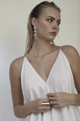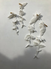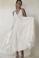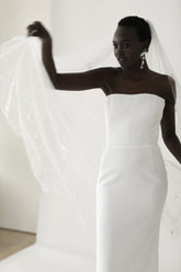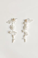 Glistening embroidery and tiers of flowers— delicate petals cascade along a minimalist ivory strand.