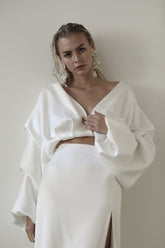 Looking for a bit more drama? Add tufts of tonal petals with chic + alluring chiffon texture to create the perfect balance of drama + subtility.
