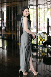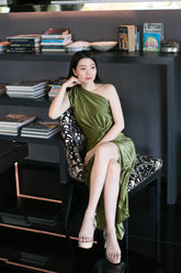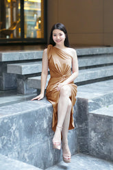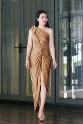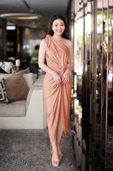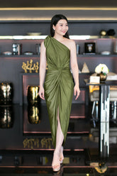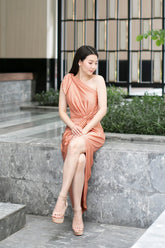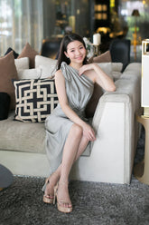 遊び心溢れるワンショルダーデザインとウエストのドレープがお腹周りをカバーしつつ、特徴的なディテールを生み出しています