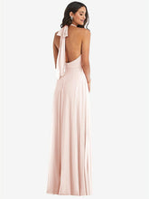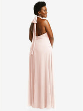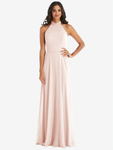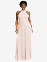 Classy, elegant, and seriously stylish, this lux chiffon halter maxi dress features a low ballet back and tasteful stand collar with a scarf tie closure at the back neck. A modified circle skirt completes the look with a timeless silhouette that exudes classic glamour.