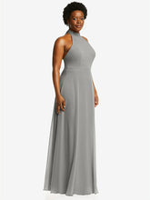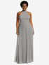 Classy, elegant, and seriously stylish, this lux chiffon halter maxi dress features a low ballet back and tasteful stand collar with a scarf tie closure at the back neck. A modified circle skirt completes the look with a timeless silhouette that exudes classic glamour.