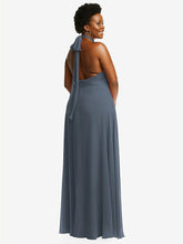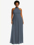 Classy, elegant, and seriously stylish, this lux chiffon halter maxi dress features a low ballet back and tasteful stand collar with a scarf tie closure at the back neck. A modified circle skirt completes the look with a timeless silhouette that exudes classic glamour.
