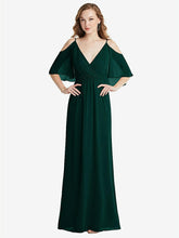 Transform your look into a stunning vision of flowy, feminine elegance. This gorgeous, lux chiffon maxi dress flaunts an alluring, draped design with a convertible cold shoulder split sleeve, V-neck wrap bodice, and a full shirred skirt that moves with you.