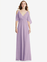 Transform your look into a stunning vision of flowy, feminine elegance. This gorgeous, lux chiffon maxi dress flaunts an alluring, draped design with a convertible cold shoulder split sleeve, V-neck wrap bodice, and a full shirred skirt that moves with you.
