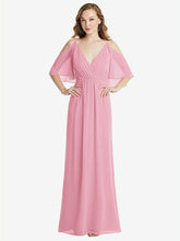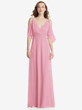 Transform your look into a stunning vision of flowy, feminine elegance. This gorgeous, lux chiffon maxi dress flaunts an alluring, draped design with a convertible cold shoulder split sleeve, V-neck wrap bodice, and a full shirred skirt that moves with you.