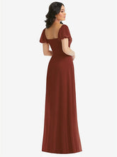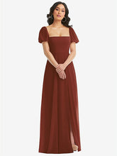 Sweet, romantic style shines through in this flowing full-length maxi dress with front slit, designed from soft lux chiffon. A square neckline flanked by pillowy puff sleeves, which can be worn on or off-the-shoulder, offers a fairytale feel for weddings and special events.