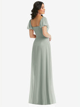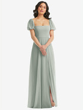 Sweet, romantic style shines through in this flowing full-length maxi dress with front slit, designed from soft lux chiffon. A square neckline flanked by pillowy puff sleeves, which can be worn on or off-the-shoulder, offers a fairytale feel for weddings and special events.