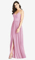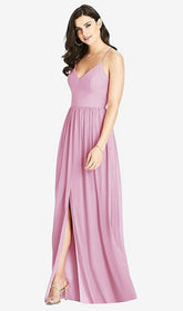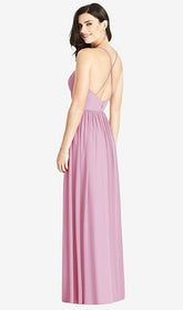 Simple and charming, the seamed bodice on this lux chiffon maxi dress impresses and complements flowing form. Enjoy a full-length shirred skirt with a center front slit, opening up room to move. A romantic v-neckline with skinny crisscross spaghetti straps ensures a flattering fit.