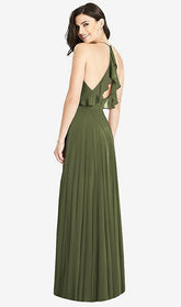 A figure-flattering draped wrap bodice and ruffle details offer a charming aura on this full-length lux chiffon dress. Romantic inverted V spaghetti straps on a low back contrast against the V-neckline, providing a stunning look. Complete with a modified circle skirt, the silhouette is the epitome of well-balanced charm.