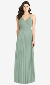 A figure-flattering draped wrap bodice and ruffle details offer a charming aura on this full-length lux chiffon dress. Romantic inverted V spaghetti straps on a low back contrast against the V-neckline, providing a stunning look. Complete with a modified circle skirt, the silhouette is the epitome of well-balanced charm.