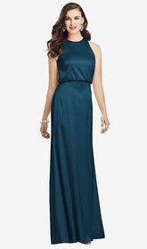 Minimal and stunning, full length sleeveless dress in a lux charmeuse textile steals the show for a memorable occasion. Blouson bodice and trumpet skirt add classic, non-fussy style.