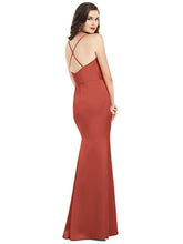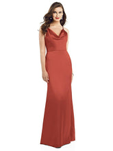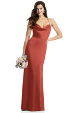 Striking full length cowl slip dress in lux charmeuse fabric stops the room and makes the night completely yours. An open back with crisscross spaghetti straps and loosely draped neckline detail lends fun and flirty style.