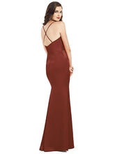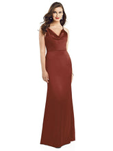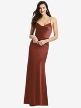 Striking full length cowl slip dress in lux charmeuse fabric stops the room and makes the night completely yours. An open back with crisscross spaghetti straps and loosely draped neckline detail lends fun and flirty style.