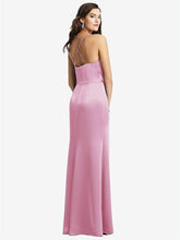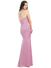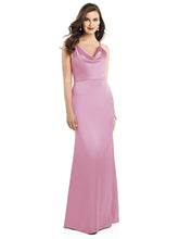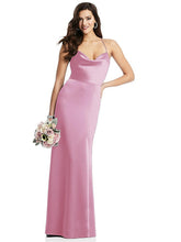 Striking full length cowl slip dress in lux charmeuse fabric stops the room and makes the night completely yours. An open back with crisscross spaghetti straps and loosely draped neckline detail lends fun and flirty style.