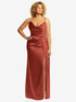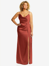 A drapey soft cowl neckline adds a romantic touch to this maxi cocktail dress. With a comfortable and silken lux charmeuse fabric all around, this elegant dress features a natural waist with a faux wrap skirt. Adding a sensual touch is a high slit on one side.