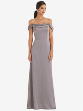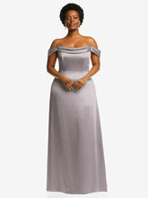 This soft and flowing A-line skirt maxi dress is cut from lux charmeuse fabric that offers a silken touch. A pleated off-the-shoulder neckline offers a swag detail and reveals bare shoulders for a romantic, flirty look.