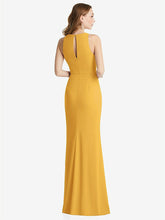 Command attention on the dance floor with this crepe halter maxi dress. Designed with a pleated side bodice and cascade ruffle slit, this beautiful dress flatters the form with a classy and elegant style.