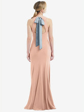A halter style jewel neckline and open back offer a formal yet flirty flair to this all-occasion maxi dress. Designed in a crepe fabric with a lux charmeuse scarf tie closure, this elegant and sleek silhouette features a trumpet skirt with a side slit. This dress can also be chosen in several colors.