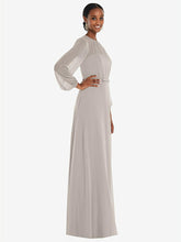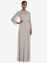 Light up the dance floor in the flowing beauty of this lux chiffon maxi dress with bow belt trimmed floor-length circle skirt. A whisper-thin, blouson overlay lends a hint of mystery to its formal, shirred jewel neckline and bishop sleeves. Soft and sophisticated, this dress is perfect for a bridesmaid.