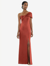 Accentuate your sleek style with the elegant twist cuff neckline featured on this formal one-shoulder dress. Beautiful lux charmeuse fabric flows like water through a princess silhouette and a soft trumpet skirt with a chic slit perfect for dancing the night away.