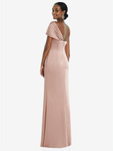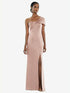 Accentuate your sleek style with the elegant twist cuff neckline featured on this formal one-shoulder dress. Beautiful lux charmeuse fabric flows like water through a princess silhouette and a soft trumpet skirt with a chic slit perfect for dancing the night away.
