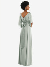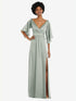 Beautiful draping in asymmetric bell sleeves and a surplice neckline lends a soft, ethereal look to this whisper satin, full-length gown. A wide sash at the flexible waist and a softly shirred skirt with a peek-a-boo slit complete the look with elegance. Pockets in skirt. Perfect for your next formal event!