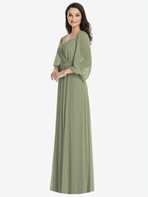 Choose an off-the-shoulder look or wear the soft bishop sleeves of this lux chiffon gown up for a more modest look. Beautiful in its every detail, this full-length formal dress boasts a shirred, modified circle skirt paired with a slight sweetheart neckline. Just right for a beautiful bridesmaid!