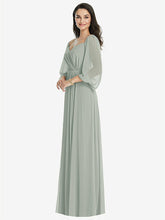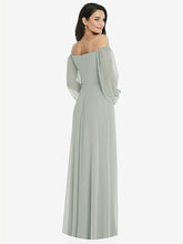 Choose an off-the-shoulder look or wear the soft bishop sleeves of this lux chiffon gown up for a more modest look. Beautiful in its every detail, this full-length formal dress boasts a shirred, modified circle skirt paired with a slight sweetheart neckline. Just right for a beautiful bridesmaid!