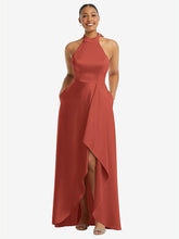 Glamorous, sophisticated style radiates from this high-neck maxi dress. A tie-back halter neckline and cascading high-low hem come together in this lux charmeuse dress, lending a striking look and style to any occasion. While convenient side pockets keep essentials close at hand. This alluring bridesmaid dress is sure to make your wedding day memorable!