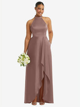 Glamorous, sophisticated style radiates from this high-neck maxi dress. A tie-back halter neckline and cascading high-low hem come together in this lux charmeuse dress, lending a striking look and style to any occasion. While convenient side pockets keep essentials close at hand. This alluring bridesmaid dress is sure to make your wedding day memorable!