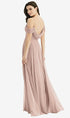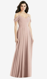 Figure-flattering draped off-the-shoulder straps complete the romantic silhouette on this lux chiffon dress. A sophisticated draped cowl cascades from the back of delicate spaghetti straps, complementing a low scoop back. Balanced with a full-length circle skirt, an hourglass shape is enhanced.