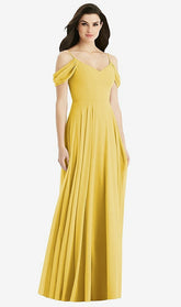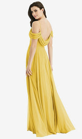 Figure-flattering draped off-the-shoulder straps complete the romantic silhouette on this lux chiffon dress. A sophisticated draped cowl cascades from the back of delicate spaghetti straps, complementing a low scoop back. Balanced with a full-length circle skirt, an hourglass shape is enhanced.