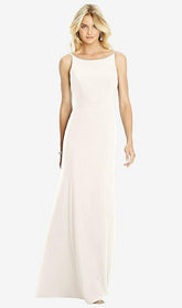 A stunningly classic bateau neckline with structured princess seams falls effortless off the shoulder in to a v-spaghetti strap open back. A body skimming trumpet skirt of this full-length sleeveless bridesmaid dress flares and flows for a dramatic entrance.