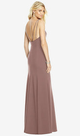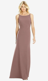 A stunningly classic bateau neckline with structured princess seams falls effortless off the shoulder in to a v-spaghetti strap open back. A body skimming trumpet skirt of this full-length sleeveless bridesmaid dress flares and flows for a dramatic entrance.