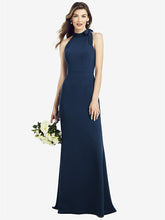 Sweeping full length sleeveless dress in a soft crepe textile lends a classic yet charming look to any special occasion. An open back drops from a modified halter neckline with a bow detail wrapped along the neck.