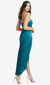 Gleaming midi length dress with stretch charmeuse fabric makes a striking statement for formal events and evenings. A high halter neckline and draped split tulip skirt lend a charming vibe.