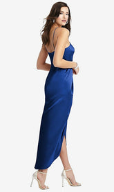 Gleaming midi length dress with stretch charmeuse fabric makes a striking statement for formal events and evenings. A high halter neckline and draped split tulip skirt lend a charming vibe.