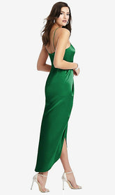 Gleaming midi length dress with stretch charmeuse fabric makes a striking statement for formal events and evenings. A high halter neckline and draped split tulip skirt lend a charming vibe.