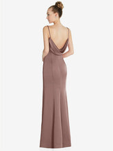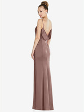 Twirl across the dance floor in style with this lux charmeuse V-neck gown. Princess seams create definition that's augmented with a draped cowl on a low back that adds a hint of sensuality. A lovely trumpet skirt completes the look with classic sophistication.