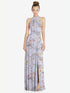 【STYLE: 6865】Halter Backless Maxi Dress with Crystal Button Ruffle Placket【COLOR: Butterfly Botanica Silver Dove】