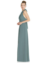 Beautifully modern while embracing classic design details, this lux chiffon maxi dress pairs a halter neckline with a ruffled placket and crystal buttons. Gorgeous for your next formal occasion, the gown offers a hint of whimsical flair with a modified circle skirt complete with a slit for easy movement from the first dance to the last.