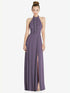 Beautifully modern while embracing classic design details, this lux chiffon maxi dress pairs a halter neckline with a ruffled placket and crystal buttons. Gorgeous for your next formal occasion, the gown offers a hint of whimsical flair with a modified circle skirt complete with a slit for easy movement from the first dance to the last.