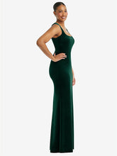Classic lines set the stage with this trumpet-style full-length velvet dress that offers a soft touch. A square neckline welcomes coordinating necklaces, and a front side slit reveals your stylish shoes.