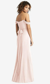 Add a Greco-Roman inspired look to your special event with this gorgeous full-length off-the-shoulder dress in soft lux chiffon. The pleated crisscross bodice design flows into a sash tie at the back waist, with draped off-the-shoulder accents creating the look of a mythical goddess. The flowing trumpet skirt features a front leg slit that accentuates every movement in this floor length bridesmaid dress.