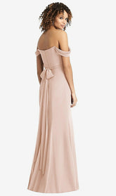 Add a Greco-Roman inspired look to your special event with this gorgeous full-length off-the-shoulder dress in soft lux chiffon. The pleated crisscross bodice design flows into a sash tie at the back waist, with draped off-the-shoulder accents creating the look of a mythical goddess. The flowing trumpet skirt features a front leg slit that accentuates every movement in this floor length bridesmaid dress.