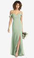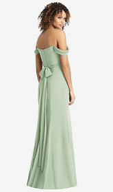Add a Greco-Roman inspired look to your special event with this gorgeous full-length off-the-shoulder dress in soft lux chiffon. The pleated crisscross bodice design flows into a sash tie at the back waist, with draped off-the-shoulder accents creating the look of a mythical goddess. The flowing trumpet skirt features a front leg slit that accentuates every movement in this floor length bridesmaid dress.