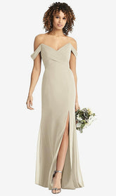 Add a Greco-Roman inspired look to your special event with this gorgeous full-length off-the-shoulder dress in soft lux chiffon. The pleated crisscross bodice design flows into a sash tie at the back waist, with draped off-the-shoulder accents creating the look of a mythical goddess. The flowing trumpet skirt features a front leg slit that accentuates every movement in this floor length bridesmaid dress.