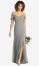 Add a Greco-Roman inspired look to your special event with this gorgeous full-length off-the-shoulder dress in soft lux chiffon. The pleated crisscross bodice design flows into a sash tie at the back waist, with draped off-the-shoulder accents creating the look of a mythical goddess. The flowing trumpet skirt features a front leg slit that accentuates every movement in this floor length bridesmaid dress.